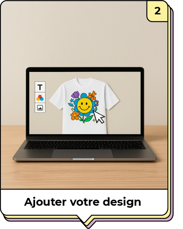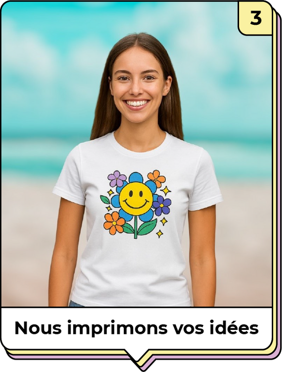 Choisissez la taille de votre impression, la couleur, et ajoutez votre personnalisation. Dès que vous approuvez votre conception, nous l’envoyons en production !